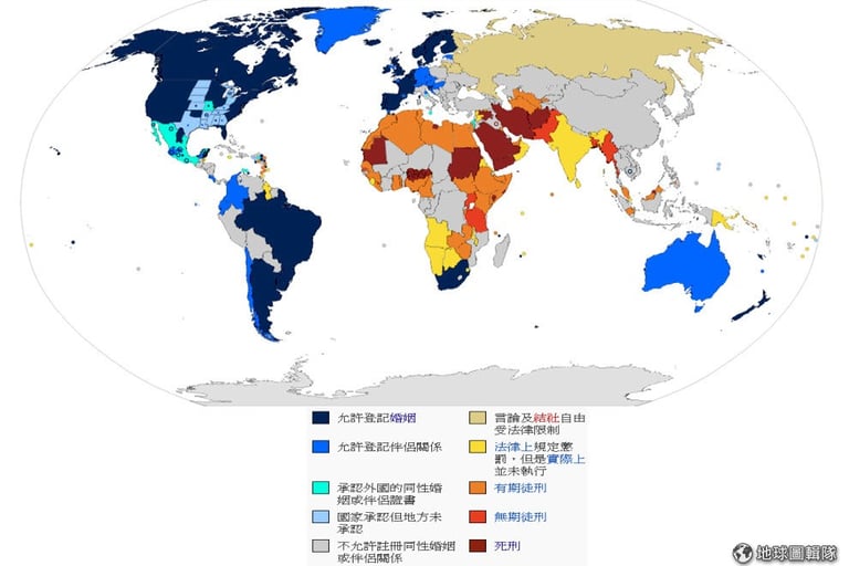 《維基百科》介紹,目前全球有 19個國家在全國性的法律中設有同性婚姻制度, 3個國家的部分州或省份有此制度。此外, 13個國家全境, 5個國家的部分州、省份或屬地,在法律上有不叫做婚姻、但實質上權利義務與婚姻相等的同性民事結合制度或生活伴侶制度。