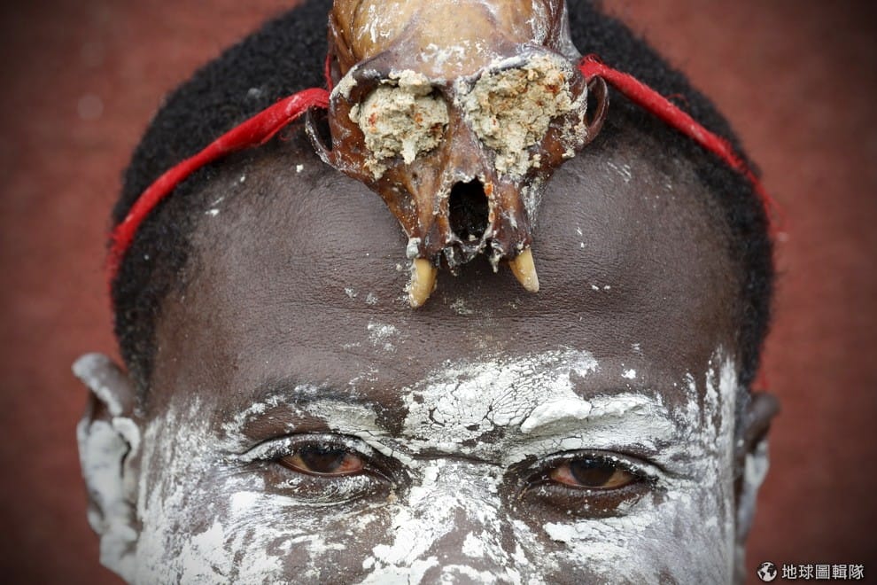 準備參加「世代交替」慶典(Generation Festival)的男子看著攝影師,象牙海岸南邊的一支原住民會在每年此時舉辦慶典,表達村落將迎接新的世代來管理他們。