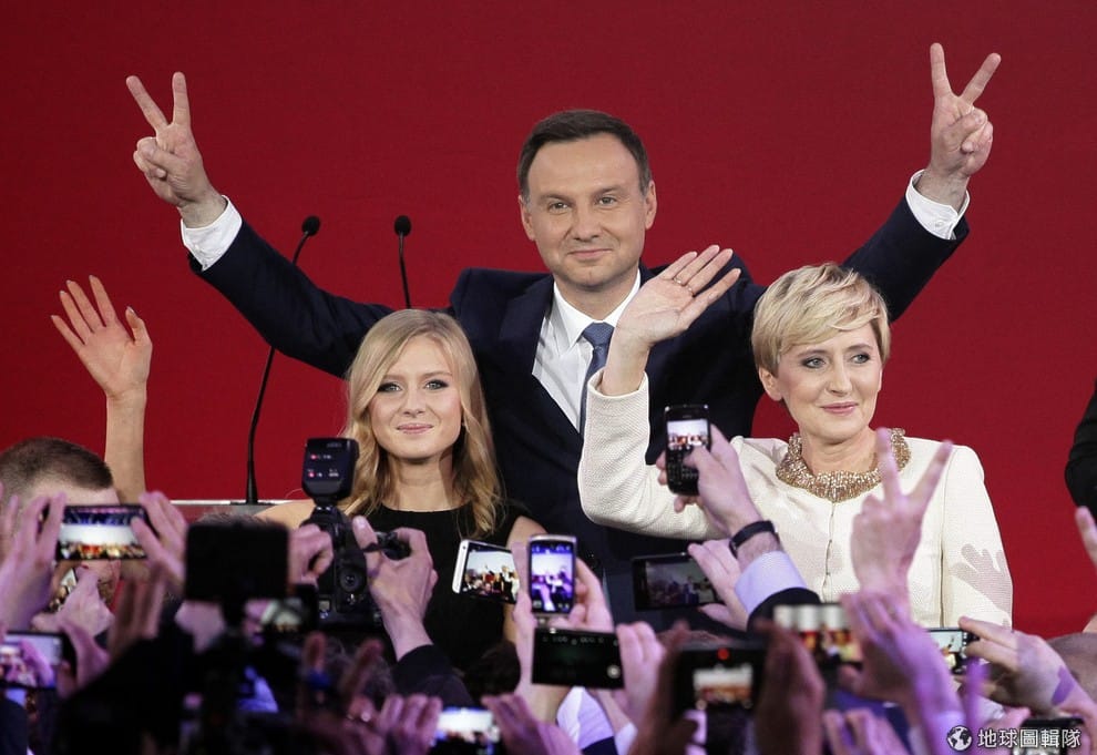 照片中央的男子是波蘭的新任總統杜達(Andrzej Duda),他在 24號這天爆冷門打敗對手,成為波蘭最新一任總統。照片中的他身邊站著妻子與女兒。