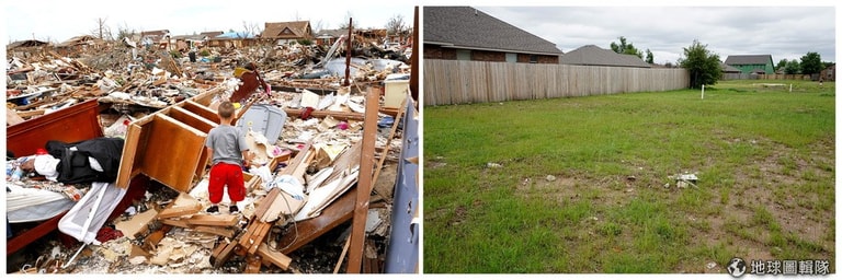 美國南部也遭到龍捲風襲擊,上圖左是奧克拉荷馬州的小男孩在遭毀的家中尋找自己的床;圖右是龍捲風襲擊前的樣子。