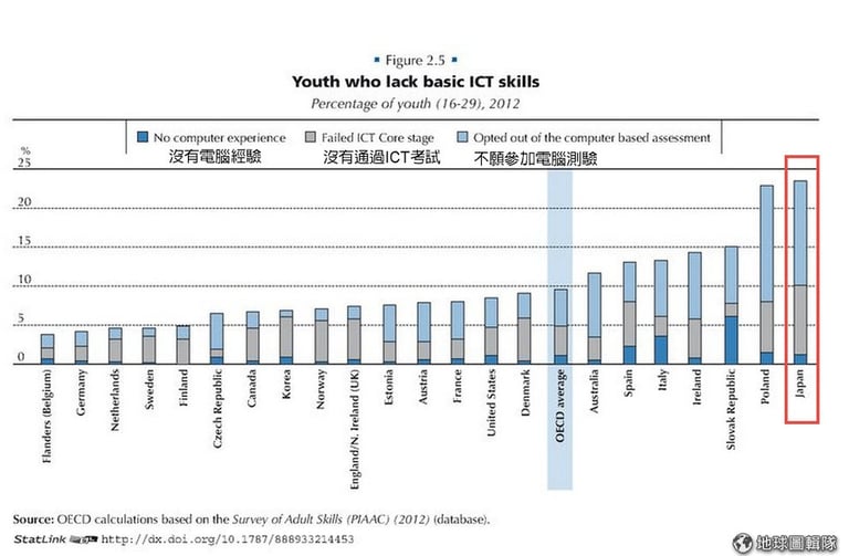 總體來看,有 25%的日本青年缺乏OECD認為的基本電腦技能,這樣的比率遠遠高過平均值 10%許多,調查中只有波蘭與日本出現相似的情況。