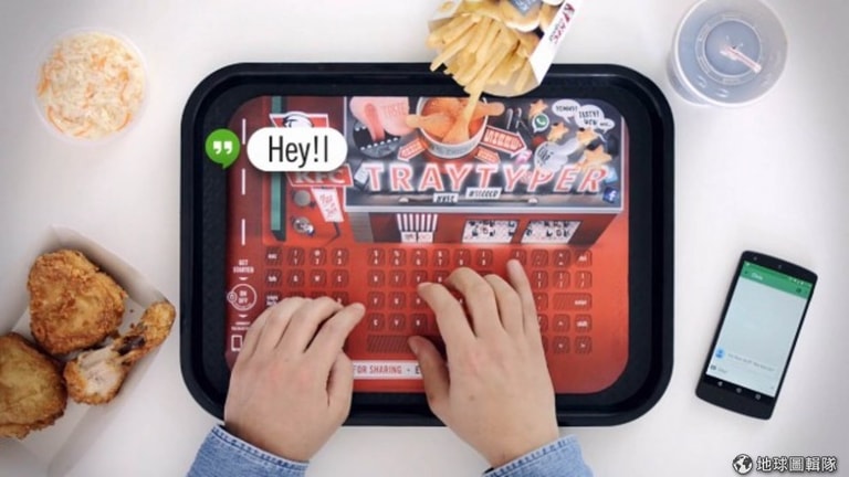 肯德基提出了 Tray Typer 這個點子,簡單講就是把裝餐點托盤中那張紙墊,換成一張跟紙一樣薄的鍵盤,Tray Typer 透過無線藍牙就能與消費者的智慧型手機或平板電腦同步連線,如此即使你豪邁地啃著炸雞時使雙手已經弄得油膩膩的,也可以直接用托盤上的 Tray Typer 超薄鍵盤打字發短訊或回覆訊息。