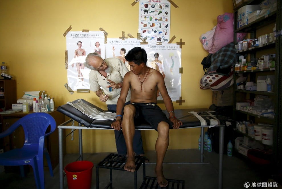 法國來的派翠克(Richard Patrick)正在替地震傷患針灸, 4月25日的尼泊爾大地震衝擊鄰近多國,根據統計,西藏藍塘(Langtang)屈就有 492名居民受傷,必須先暫時安置在寺院中。