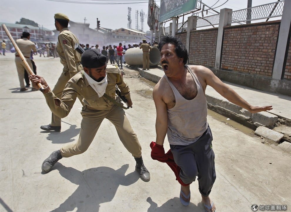 警察拿著警棍追打示威者,這名示威者與其他人不滿被欠薪和工作制度走上街頭,期間他們求政府該對短期工作有相關規範。