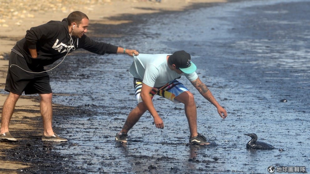 加州瑞福吉歐州立海灘(Refugio State Beach)旁,民眾正合力把海岸上被油汙包覆的小鳥救上岸。加州海岸旁的一條原油管線破裂,海岸巡邏隊人員來不及做出防護海灘的動作,大約 2.1萬加侖的原油就這樣汙染了海洋。