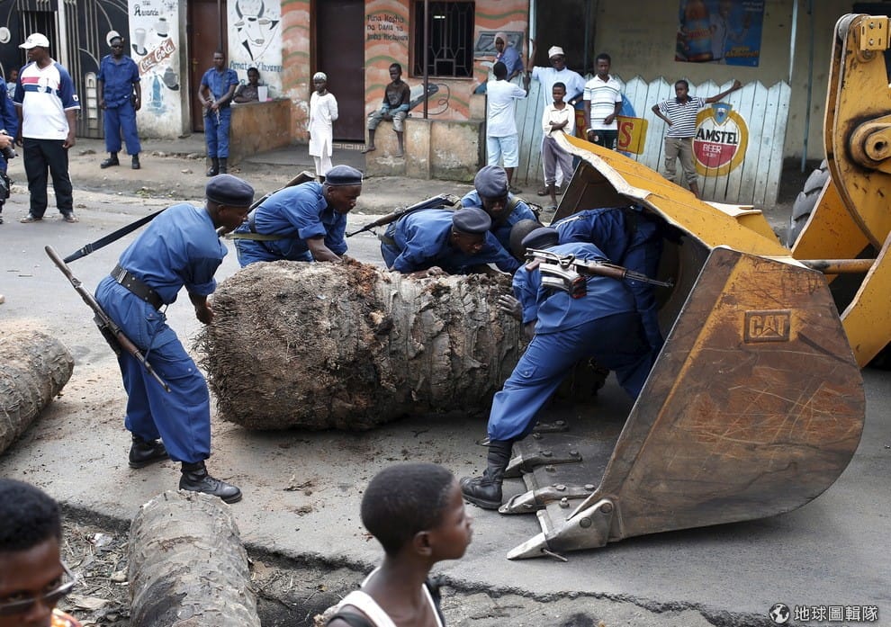 警察正忙著把示威者架起的路障拆除。蒲隆地的民眾抗議現任總統恩庫倫其薩(Pierre Nkurunziza)違憲連任。