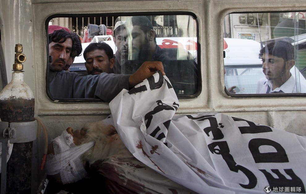 人們看著車內遭人殺害的乘客。巴基斯坦西南的俾路支省在 29號晚間發生武裝分子劫持巴士事件,總計有 35名乘客遭綁架,其中至少 19人不幸遭殺身亡。