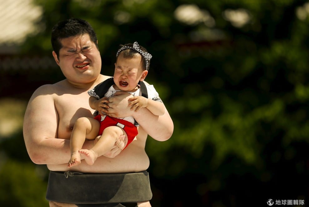 東京淺草寺內,業餘相撲人抱著大哭的寶寶一臉苦笑。淺草寺在 30號時舉辦寶寶哭聲大賽,比賽方式是讓相撲選手抱著參賽寶寶,場中的裁判會對寶寶做鬼臉並發出巨大聲響,藉此弄哭寶寶,看哪一位寶寶的哭聲分貝數最大就是贏家,當地民眾認為,這樣的儀式可以幫寶寶們更健康順利地長大,同時趕跑邪靈。 30號這天的活動總計有 120名寶寶參加。