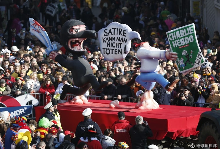 今年 2月的查理周刊攻擊事件讓整個歐洲人心惶惶。在德國的玫瑰星期一嘉年華上,一台花車裝飾著伊斯蘭國戰士追著斷頭的查理周刊編輯跑。