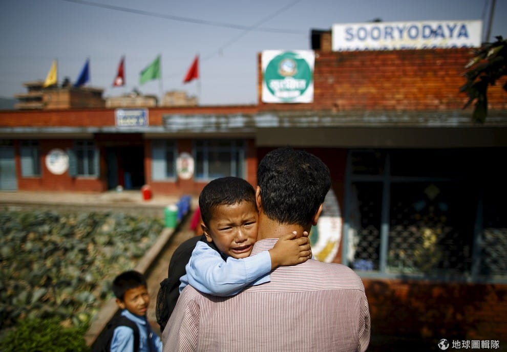 4歲的薩克斯漢(Saksham Karmacharya)邊哭邊緊抱爸爸,嚷著不想上學。歷經 4月25日的大地震後,尼泊爾的學校在 31號時重新復學。