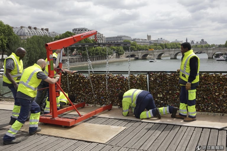 穿著黃色背心的工作人員一大早就來到巴黎的著名地標藝術橋,揮舞著剪鎖工具,把掛在橋上的鎖頭剪下,好奇的遊客紛紛駐足觀看。