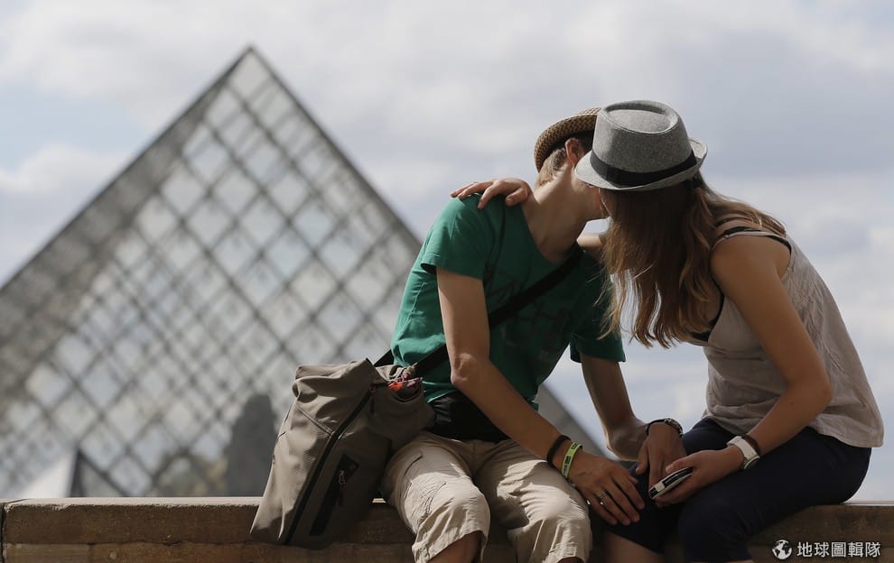 就算沒有了愛情鎖,巴黎仍然是充滿愛情的城市。圖為一對情侶在羅浮宮前親吻。