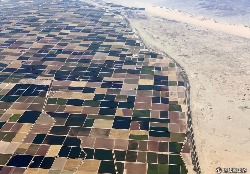 空拍照下的農田緊靠著加州帝王縣(Imperial valley)的沙漠區,加州史上最惡劣的乾旱持續衝擊當地。