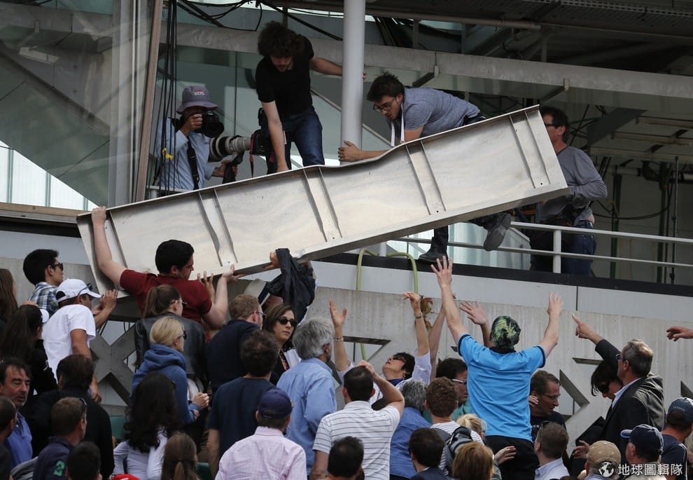 巴黎當地,正舉辦法國網球公開賽的卡特麗耶球場(Court Philippe Chatrier)傳出意外,法國選手宋嘉(Jo-Wilfried Tsonga)對戰日本錦織圭(Kei Nishikori)時,場外一處鐵造建築發生倒塌。照片中的工人們正忙著善後。