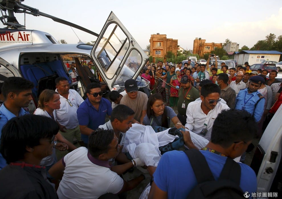 加德滿都市區內,人們合力將罹難者遺體從直升機卸下,這名罹難者和其他人在進行地震災區的救援行動中不幸墜機罹難。尼泊爾在 4月25日發生八十年來最大強震,釀成嚴重死傷。