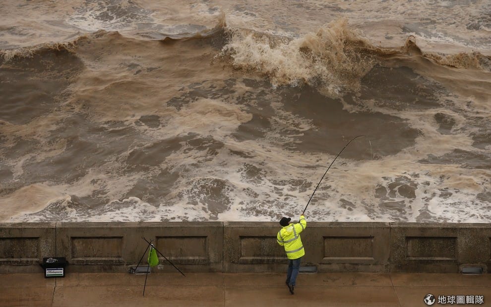 英國英格蘭西北的黑潭區(Blackpool),一名釣客在惡劣天氣中釣魚。