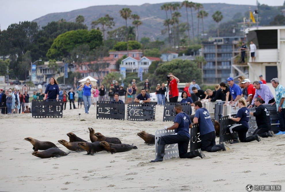 2號時,加州的太平洋哺乳動物中心選定拉古納海灘,作為釋放 14隻小海獅回大海的地點,照片中的攝影師和飼育員們都盯著小海獅們看。這些小海獅,以及其他已經死亡的海獅在今年 4月時遭不明人士加入池水的氯氣重傷。