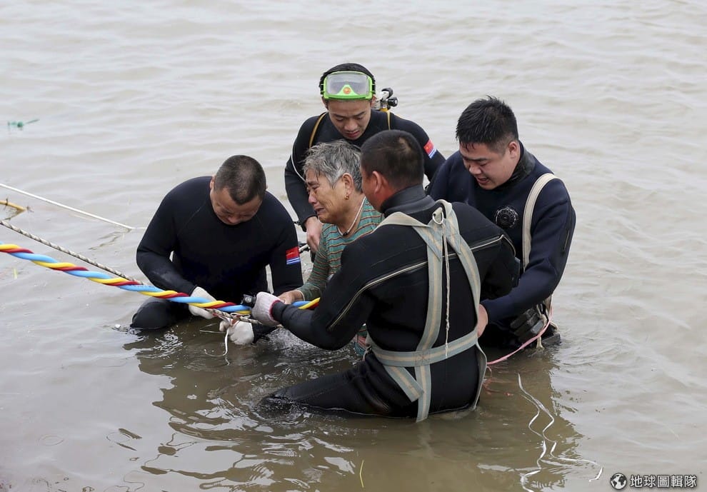 救難人員合力將船難的受害者拉到岸上。 6月1日晚間,中國東方之星號郵輪在長江翻覆,船上 456人中只有 14人獲救,上千名搜救人員仍在事故現場待命,希望能有奇蹟出現。