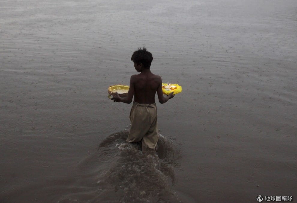 小男孩拿著油燈走入河中,他與其他居民正在敬祝寬恕節(Shab-e-Barat festival)。