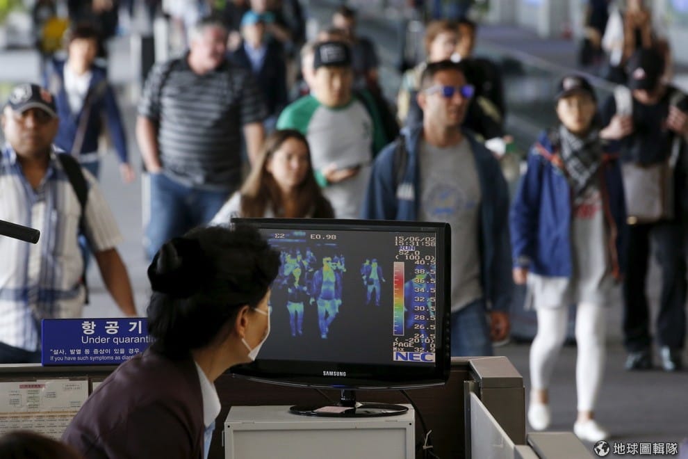 南韓的仁川機場內,乘客們魚貫走過感測器前。近日南韓的「中東呼吸症候群冠狀病毒感染症」(MERS-CoV)確診病例暴增,引發當地及鄰國緊張。
