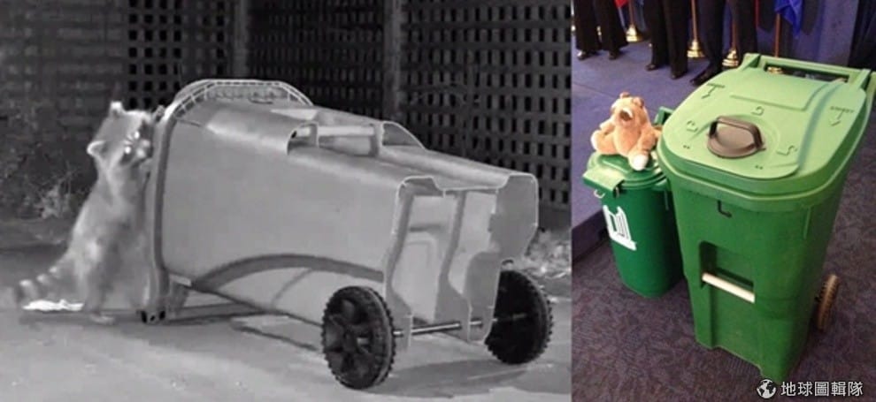 翻找垃圾桶裡的食物,又翻倒垃圾桶,讓浣熊成了多倫多市的頭號市容破壞者,市政府只能搬出又高又大和加了鎖扣的垃圾桶來對付牠們。 取自網路