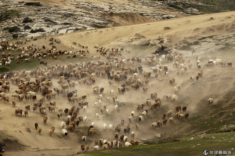 新疆維吾爾族自治區中,牧羊人正忙著把羊群趕到另一處的牧場。