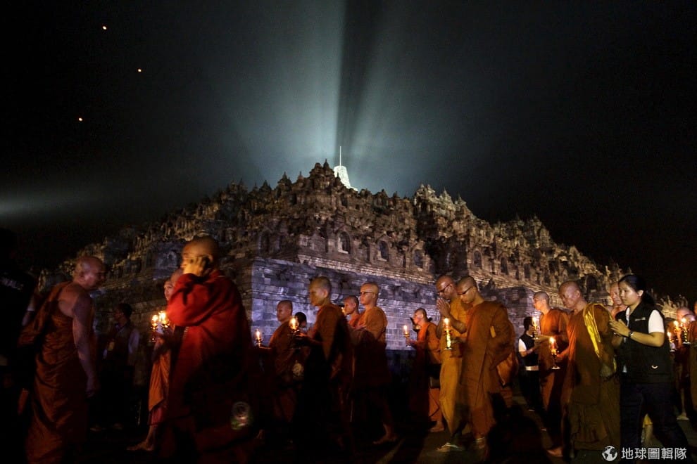 慶祝佛誕節的佛教徒們,一起走過佛寺前。
