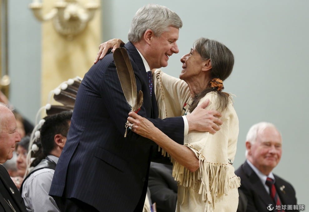 當年寄宿學校的原民學生,和加拿大總理哈珀擁抱,象徵和解的到來。