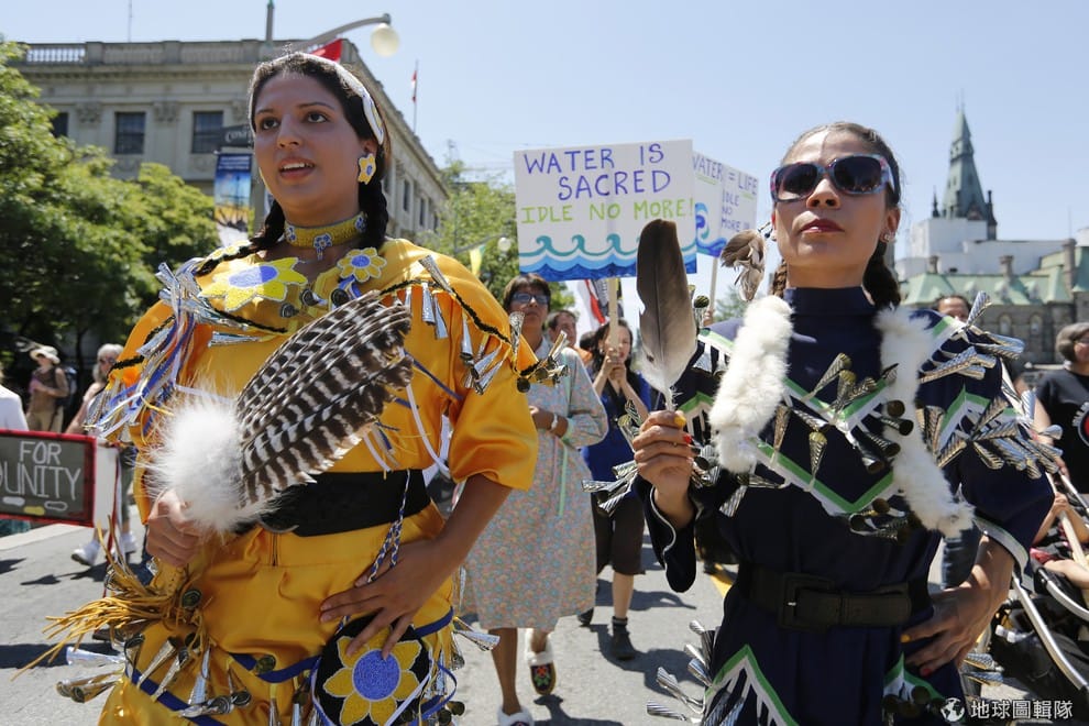 加拿大原住民穿著傳統服飾,上街表達他們對環境惡化的關心,向政府爭取權利。