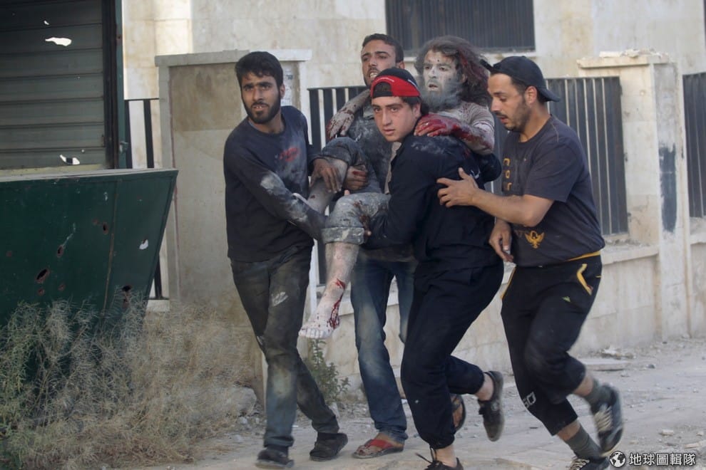 居民抬著一名受傷的男人,他們待的地方遭到效忠敘利亞總統阿薩德(Bashar Al-Assad)軍隊轟炸。