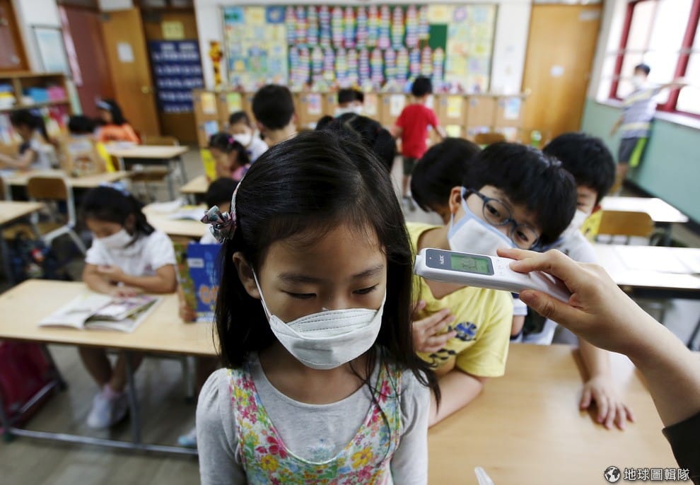 在首爾的小學,戴著口罩的小學生正在量體溫,檢查有沒有傳染病MERS (中東呼吸症候群冠狀病毒感染症)的症狀。南韓保健福祉部在 9號時表示,南韓新增 8名確診得到MERS的病人,讓南韓得到MERS的總病例增加到 95人,不過跟前一天確診的 23名新病人,得到MERS的人已經大幅下降。