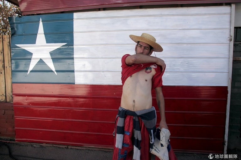 一名足球迷秀出他的刺青,他正在參觀智利國家足球隊的訓練。美洲盃足球賽即將開踢,智利將會在A組比賽中對上墨西哥、厄瓜多和玻利維亞。