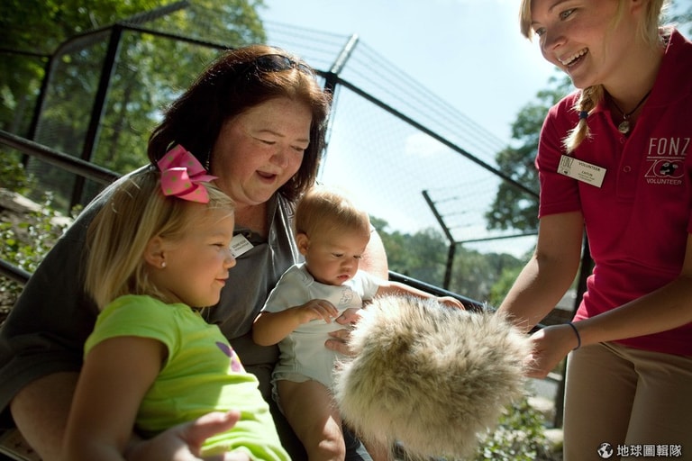 飼育員正拿著灰狼的毛球給小朋友認識一下。Allison Shelley/Getty Images