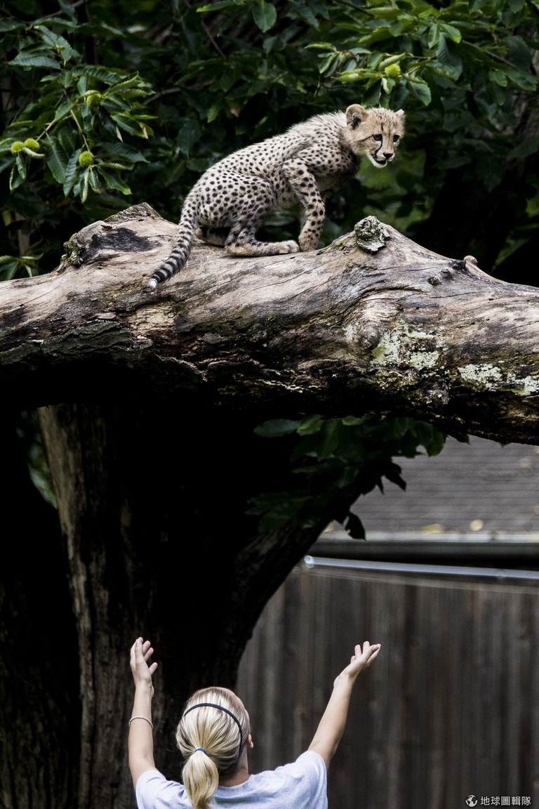 漂亮的小獵豹正想著要不要跳下來呢。Allison Shelley/Getty Images