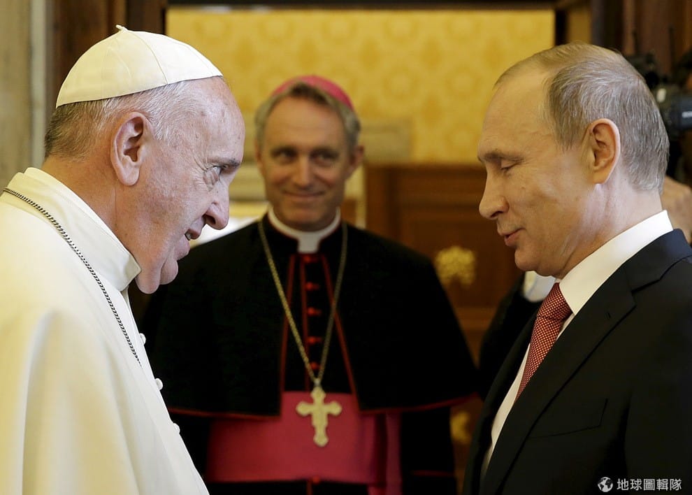俄國總統普亭(右,Vladimir Putin) 10號出訪義大利,再到梵諦岡拜訪教宗。教宗方濟各特別送他一面印有和平天使的獎牌,邀請普亭一起為世界和平努力。
