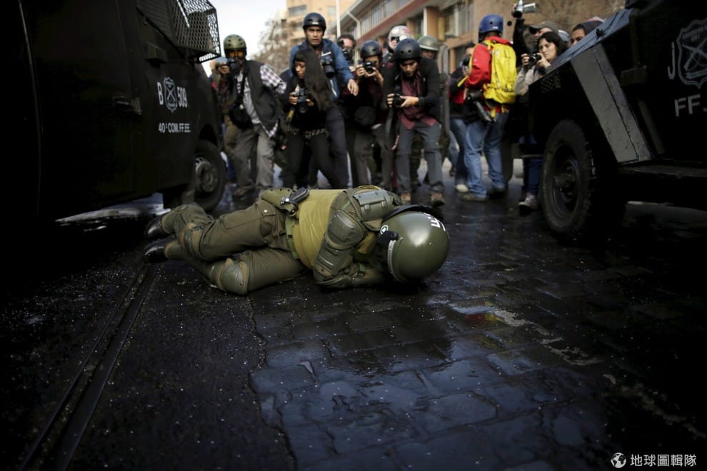 在示威活動中,一名警察與學生發生衝突倒在地上。從這禮拜一開始,智利學生就開始示威要求教改,示威也進一步在 10號時擴大規模,學生們放火燒首都的交通幹線阿拉美達大道(Alameda Avenue),阻塞當地的交通。同時,智利南部的瓦巴萊索(Valparaiso)和康塞普松市(Concepcion)也都出現了抗議活動。