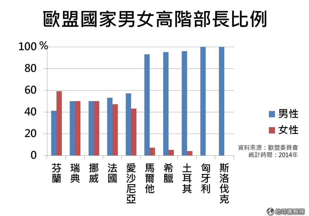 根據歐盟的統計,2014年歐盟國家的高階部長男女比最平衡的國家是芬蘭;性別失衡最嚴重的是匈牙利和斯洛伐克。製圖:地球圖輯隊
