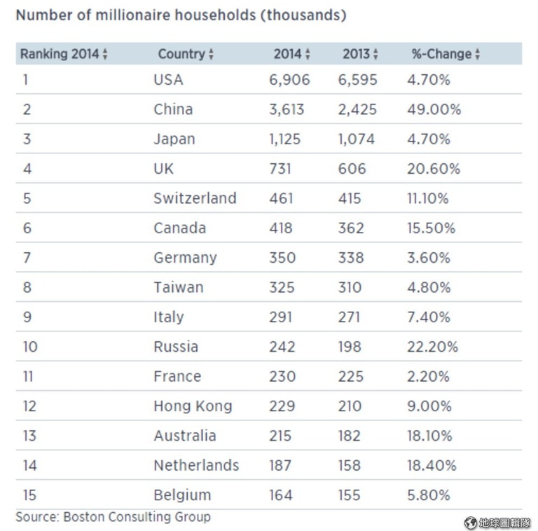 BCG 的財富資產報告同時揭露了資產達到百萬的富翁家庭*數據,美國共有 690.6 萬戶成為全球最多百萬富翁的國家,較 2013 年成長了 4.7%,而中國百萬富翁家庭巨幅成長了 49%,至 361.3 萬戶,來到第二,台灣 2014 年百萬富翁家庭則至 32.5 萬戶,成長了 4.8%,位居第八,還贏過法國、香港、澳洲、荷蘭、比利時等國。
