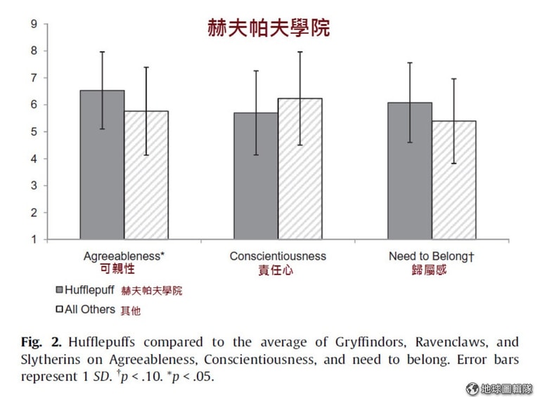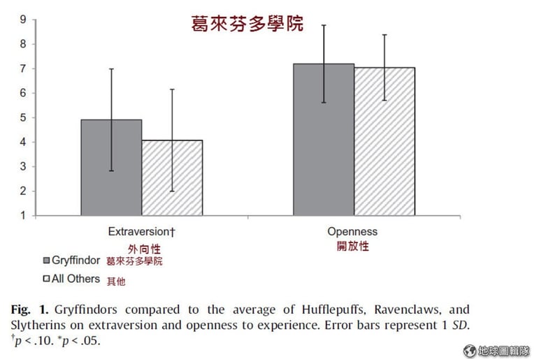 至於主角哈利波特的「葛來芬多」學院,受試者平均在「外向性」上高出其他學院學生;「赫夫帕夫」學院的「學生」們,在和藹可親以及歸屬需求等項目上高於其它學院;「雷文克勞」學院,則是在「喜歡思考」(Need for cognition, desire for careful thinking)上有顯著表現。值得注意的一點是,大部分受試者對自己被分類進去的學院,都有展現出想進去的慾望。