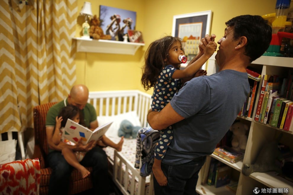 今年 50歲的豪(Jason Howe, 圖右)和他同年的丈夫佩雷茲布魯達(Adrian Perez-Boluda)正想辦法把他們三歲的雙胞胎女兒哄上床。他們兩人在 2008年的時候分別在西班牙和加州登記結婚,生活幸福美滿。