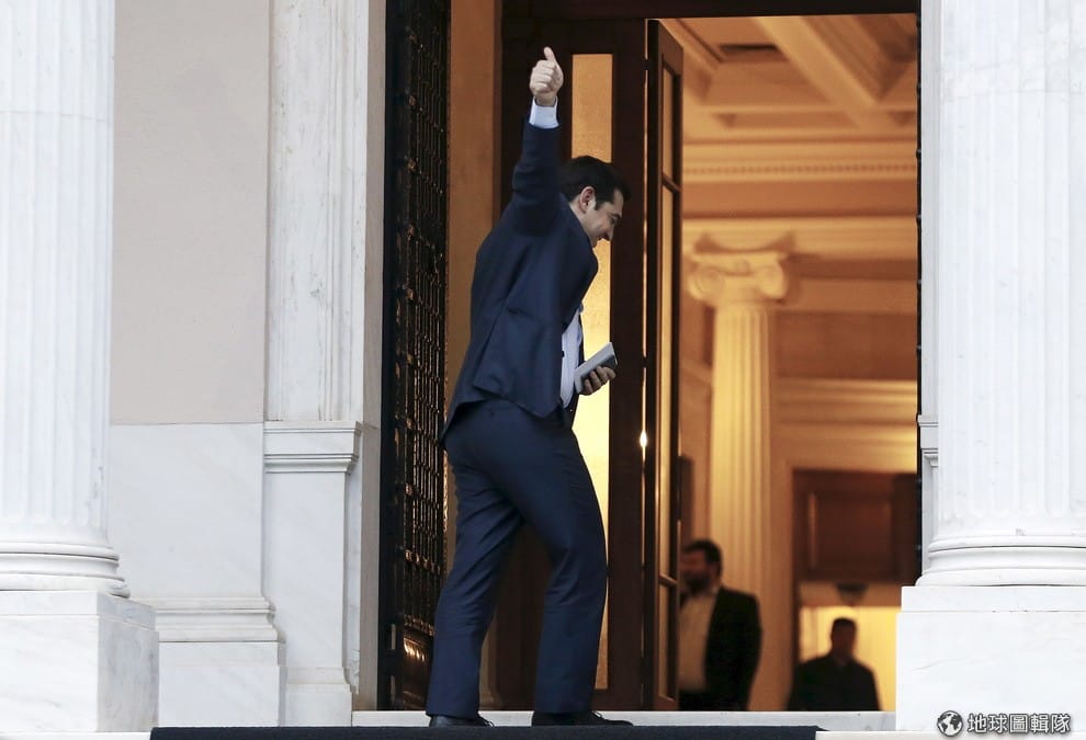 希臘總理齊普拉斯(Alexis Tsipras)在進入位於雅典的希臘總理府時,向外界舉起大拇指。齊普拉斯日前指控國際債權人威脅希臘,要是不遵守他們的條件就不提供現金紓困,如此一來希臘一定會陷入債務違約的困境,大大增加了退出歐元區的可能性。