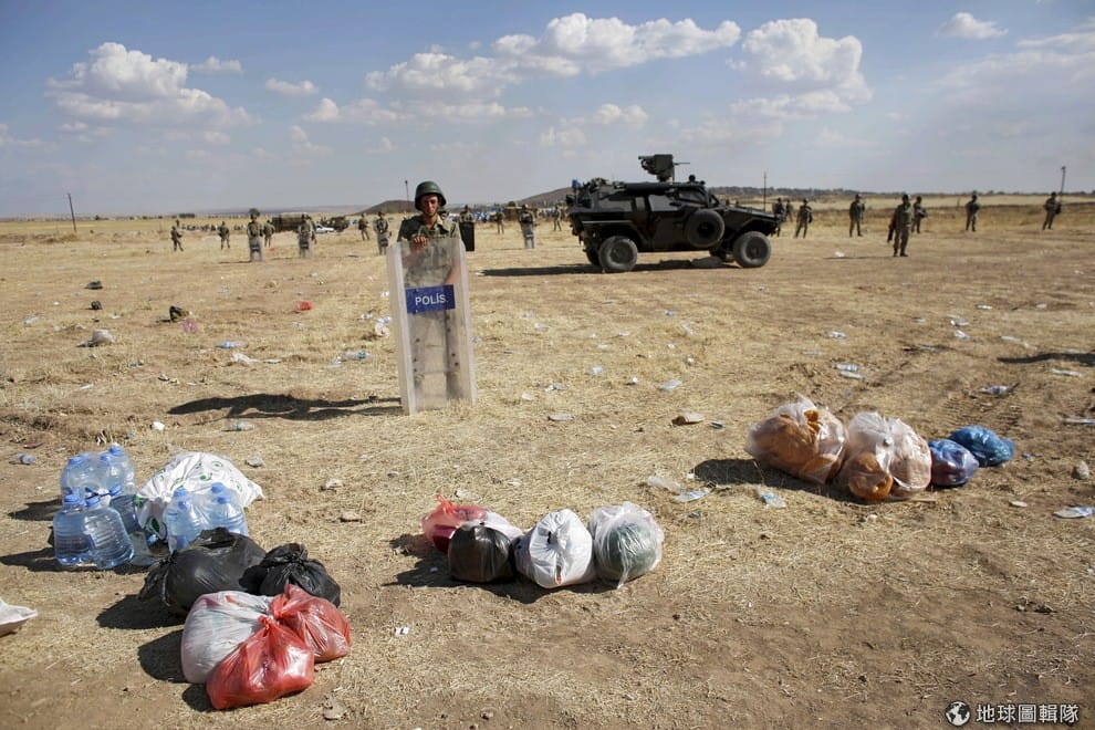土耳其庫德族人將一包包裝著食物的塑膠袋放在地上,希望土耳其和敘利亞的邊界警察可以把這些補給品交給他們住在邊界城市科巴尼(Kobani)的親友。敘利亞和土耳其交界的科巴尼遭到伊斯蘭國武裝分子襲擊,造成至少 145名平民喪生。