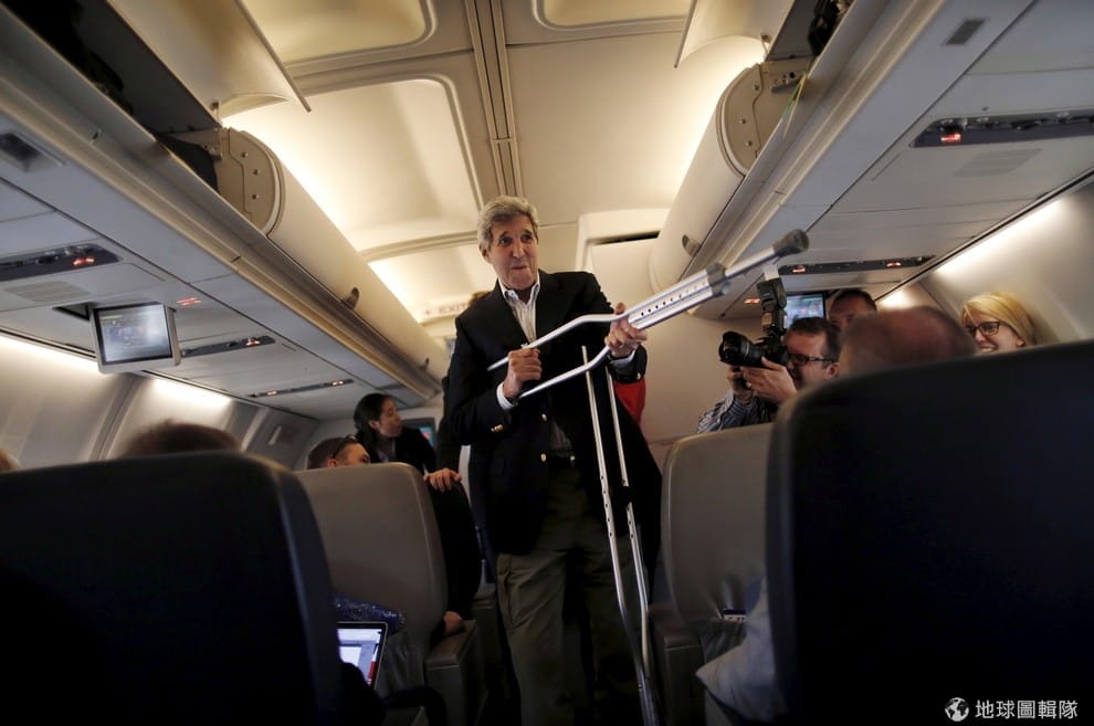 美國國務卿凱瑞(John Kerry)俏皮地對著飛機上的記者玩著他的拐杖。他正準備飛往奧地利維也納和其他世界五強(英、俄、法、德、中)與伊朗討論核武問題,希望伊朗可以遵守他們先前的協議,不要製造核武。