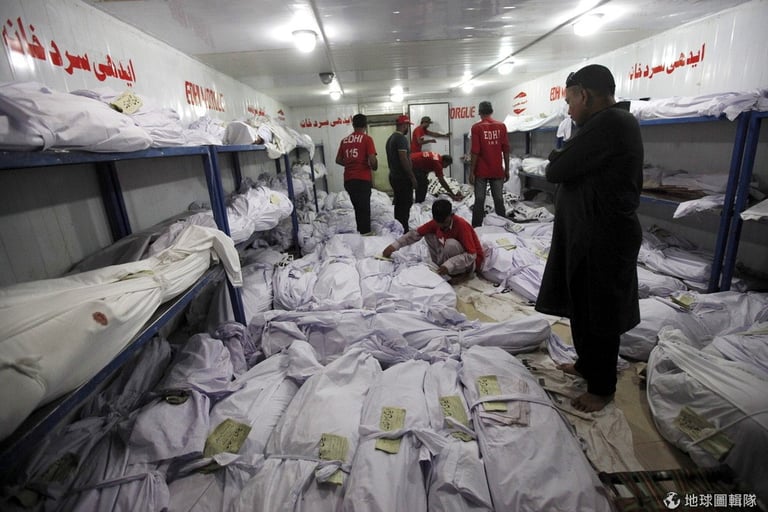 BBC、CNN、巴基斯坦《論壇》綜合報導,巴基斯坦東南方的信德省(Sindh)傳出 1,200多人被熱死的消息,死者的遺體堆疊在爆滿的停屍間中,更糟的是,當地的限水限電措施讓遺體少了冰存,開始腐敗傳出惡臭,走訪當地的記者就形容空氣中黏稠的屍臭味讓她「這輩子都忘不了」。