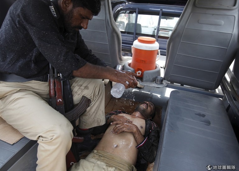 巴基斯坦被熱浪襲擊,照片中的警察因為受不了高熱倒下,他的夥伴正緊急替他降溫。