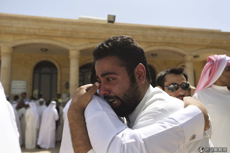 科威特伊瑪目沙德清真寺爆炸現場外,伊斯蘭信徒互相擁抱,大家都餘悸猶存。