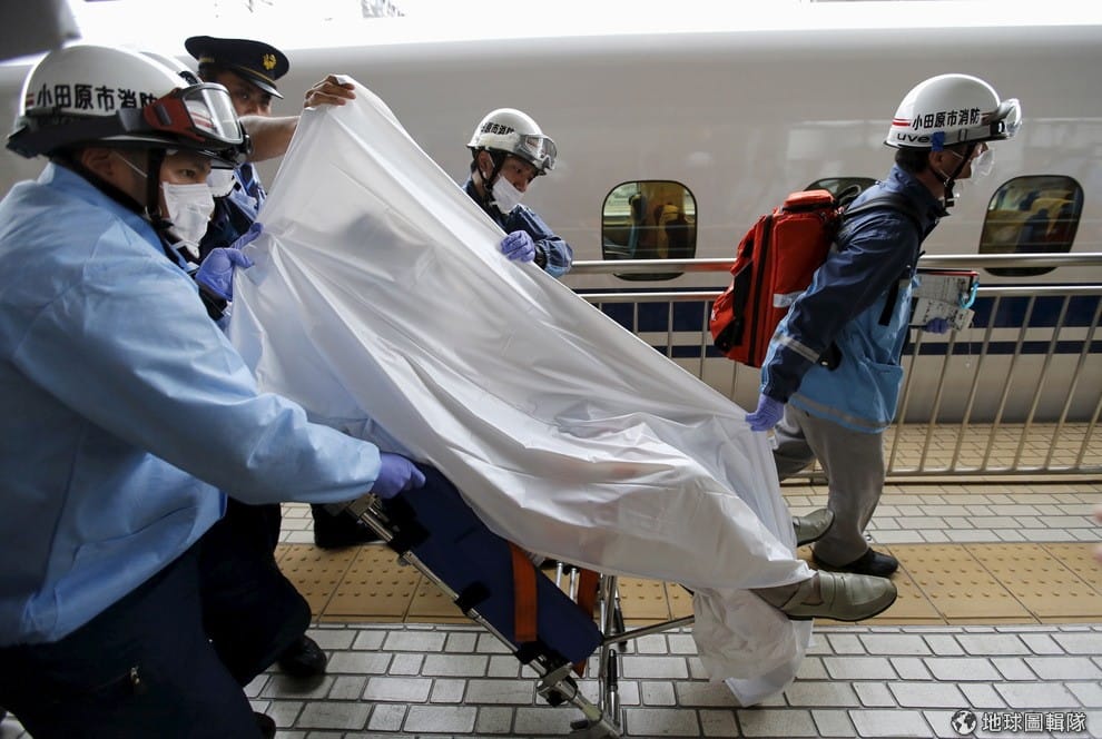 一名傷者坐在擔架上被救援人員送往醫院。30號這天,在東京往大阪的新幹線上,一名男子疑不滿退休金太少而引火自焚,造成濃煙瀰漫,不少人遭嗆傷,共有 2人在這起事件中身亡,26人受傷,新幹線安檢問題再次浮上檯面。