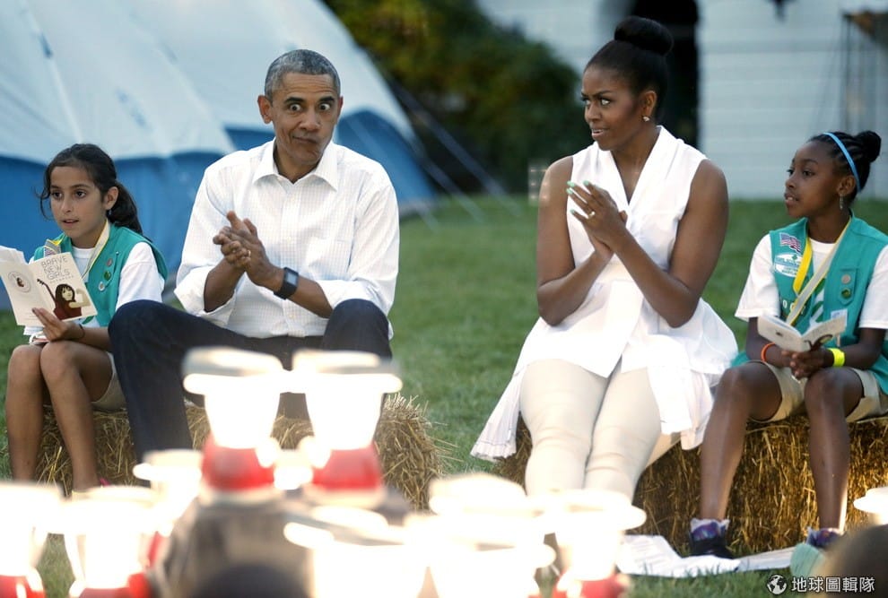 美國總統歐巴馬(Barack Obama)和第一夫人蜜雪兒(Michelle Obama)開心的陪女童軍露營。30號這天,白宮開放南方草坪歡迎女童軍進入紮營,總共有 50名女童軍在白宮過夜。