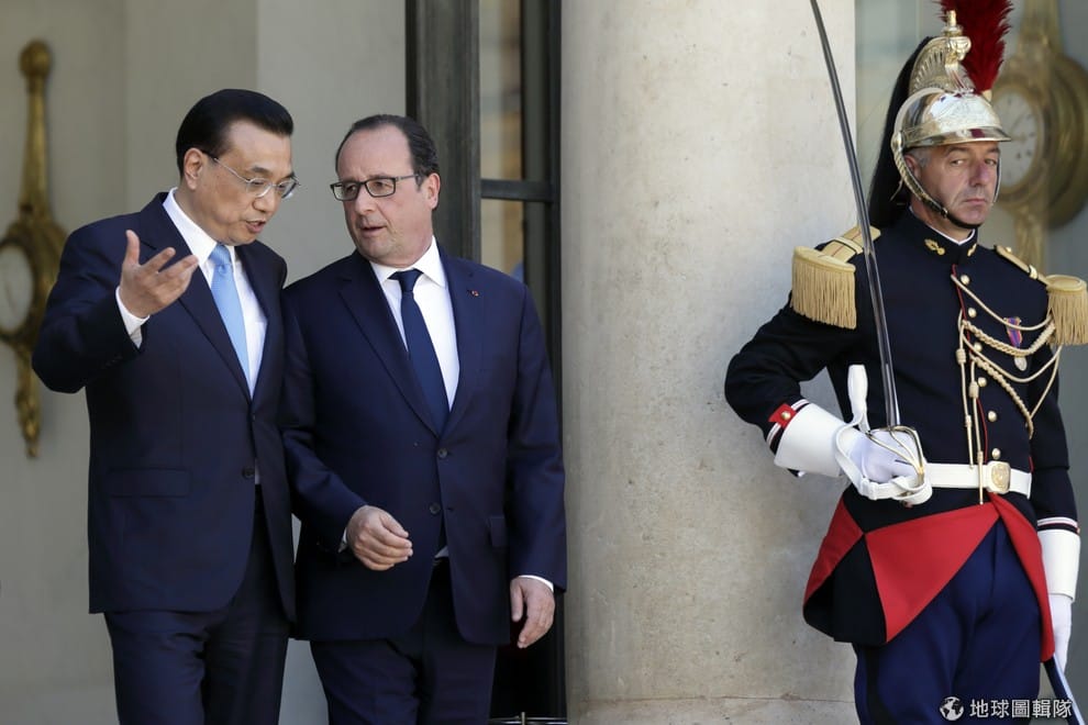 法國總統歐蘭德(Francois Hollande, 圖右)伴著中國國務院總理李克強步出總統府。中國國務院總理李克強於 30號開始為期三天的訪法行程,此行最重要的就是談妥與法國在第三方市場的合作。