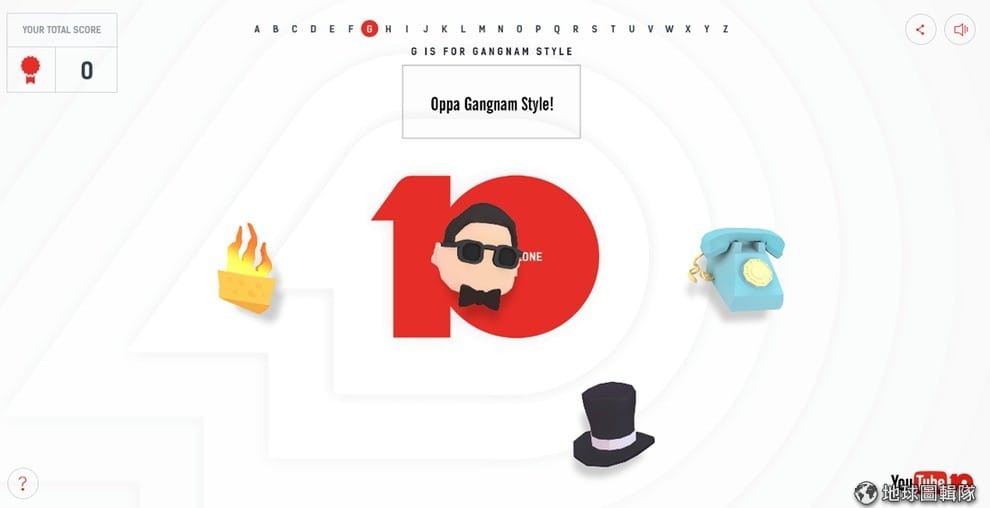 The A-Z of YouTube 按照字母 A 到 Z 精選 26 支不同類別的 YouTube 影片,並設計成 26 道題目挑戰積分,考考你在這十年來,是否有完全掌握 YouTube 影片的流行趨勢?就算答錯也沒關係, YouTube 就是希望網友能在輕鬆的遊戲過程中,重新回味 YouTube 上最值得懷念的時刻,甚至重新認識一些你可能沒有 Follow(追蹤)到的頻道或影片,一同祝賀 YouTube 帶給世界的精彩十年!